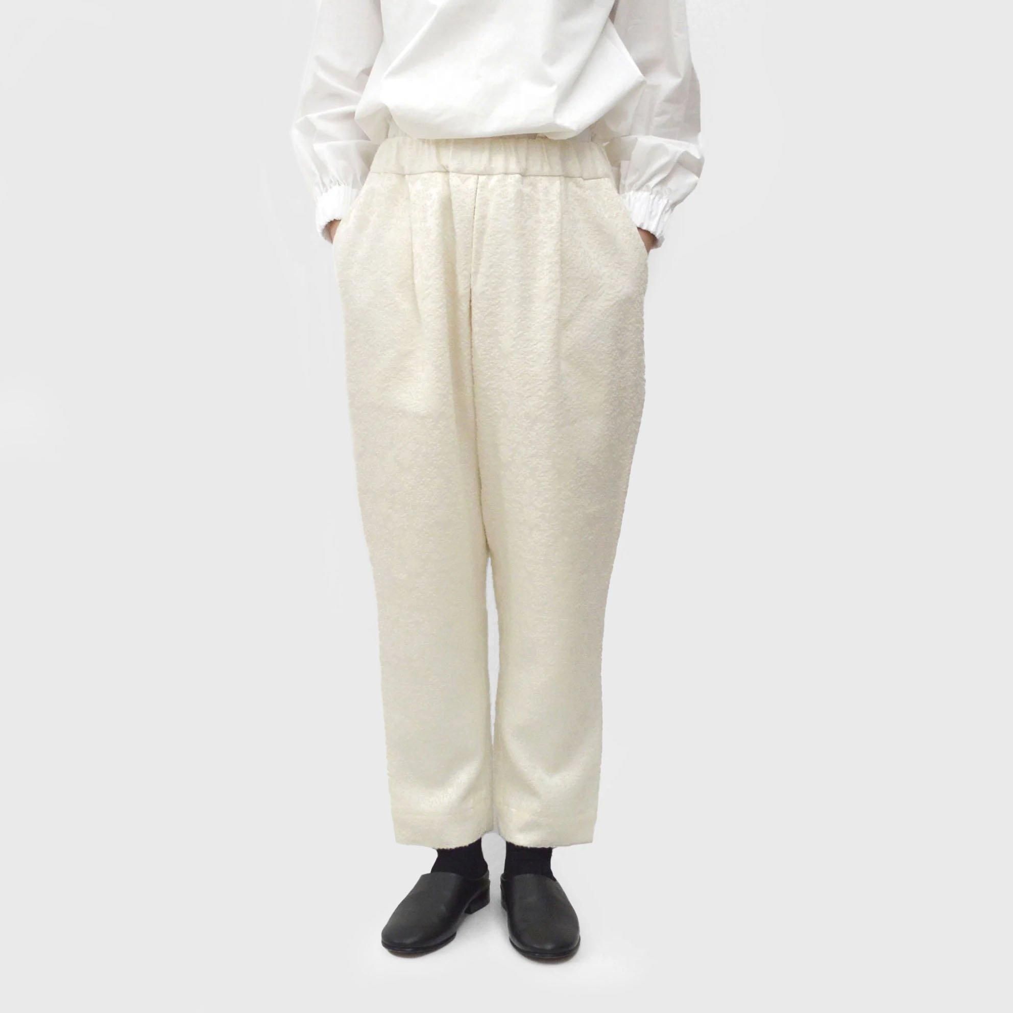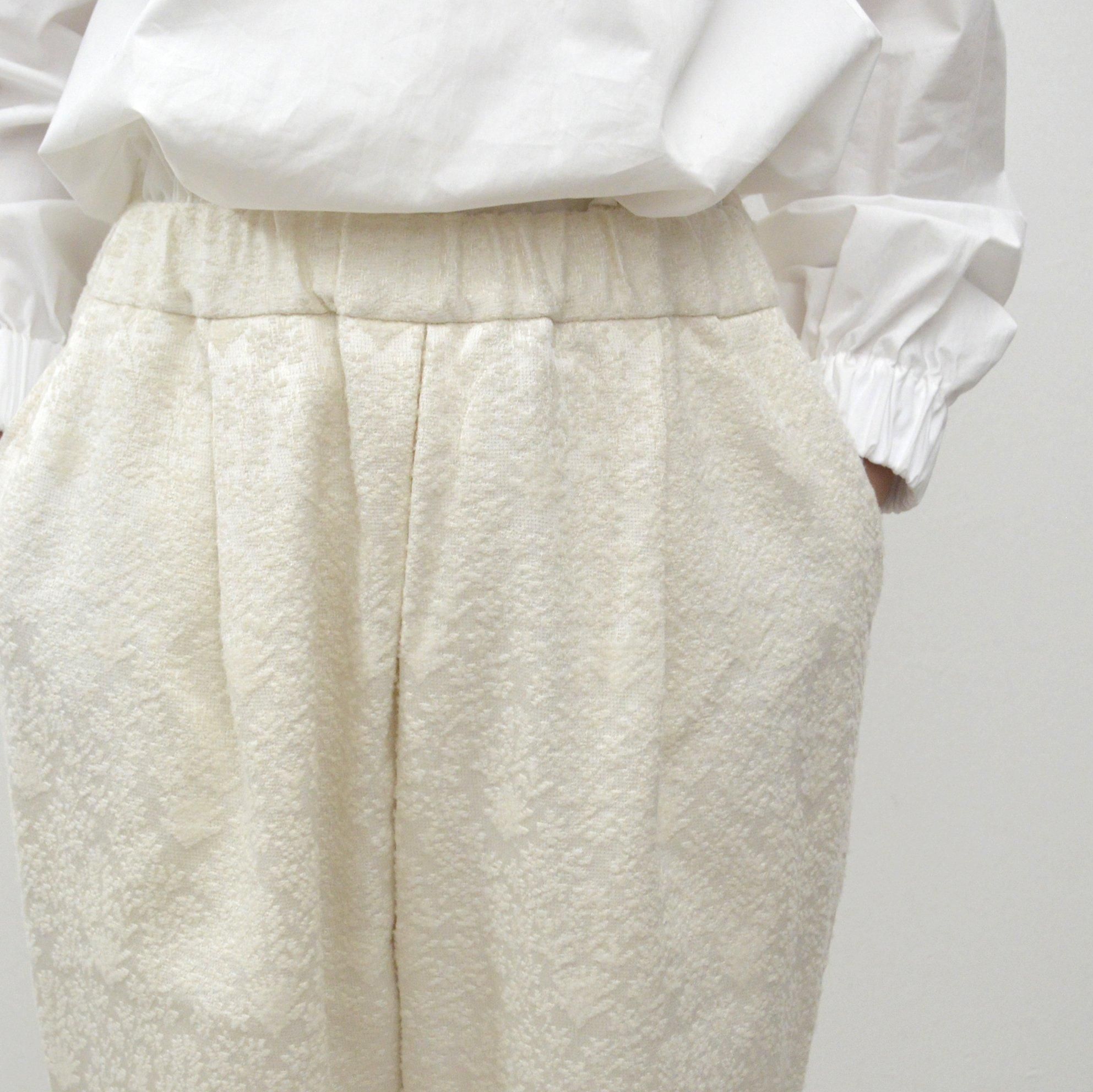 ジャガード織の美しい唐草模様が特徴のフォークパンツ。
