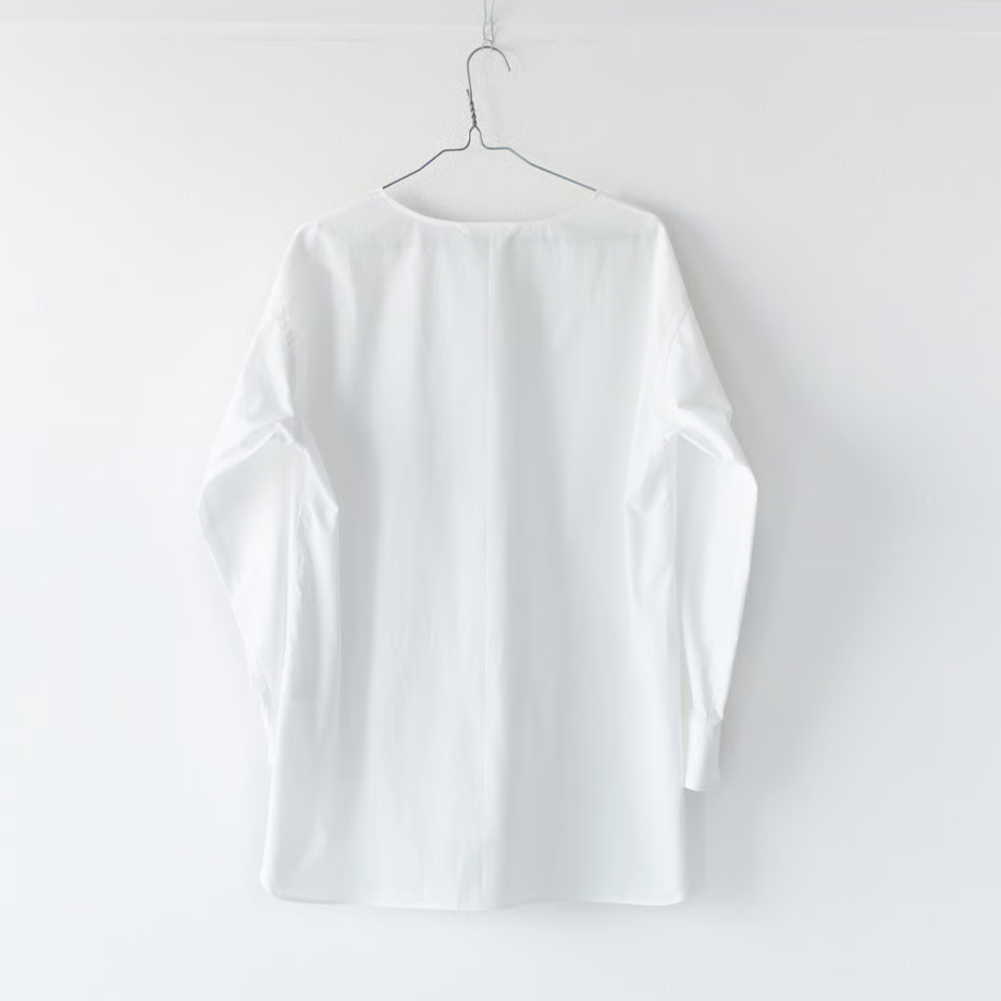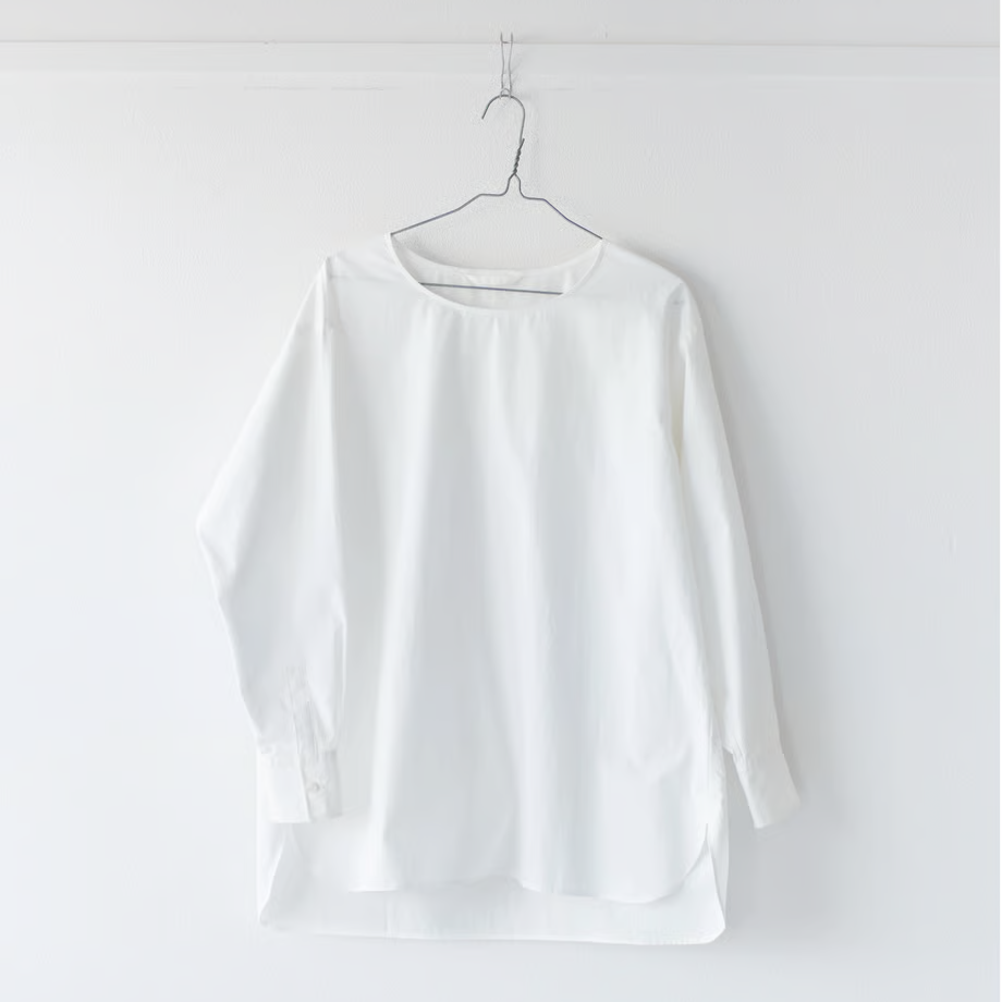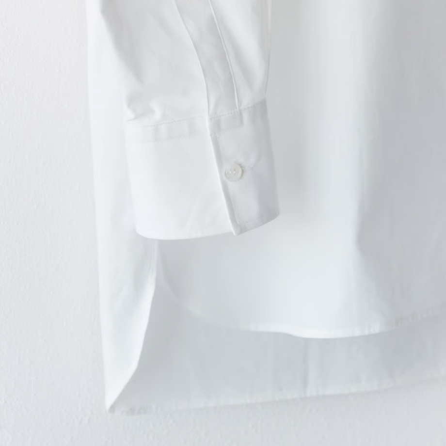 特徴的な袖口はメンズシャツのようにキリッとした感じ、そしてボトムスの外に出しても着れるように丈はやや長め、サイドは緩やかなスリットになっています。