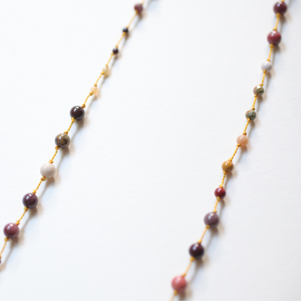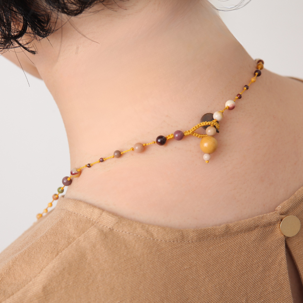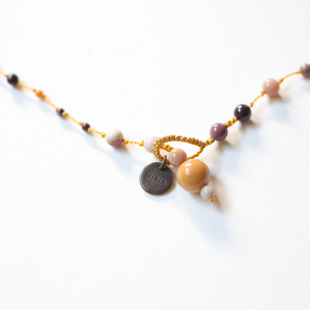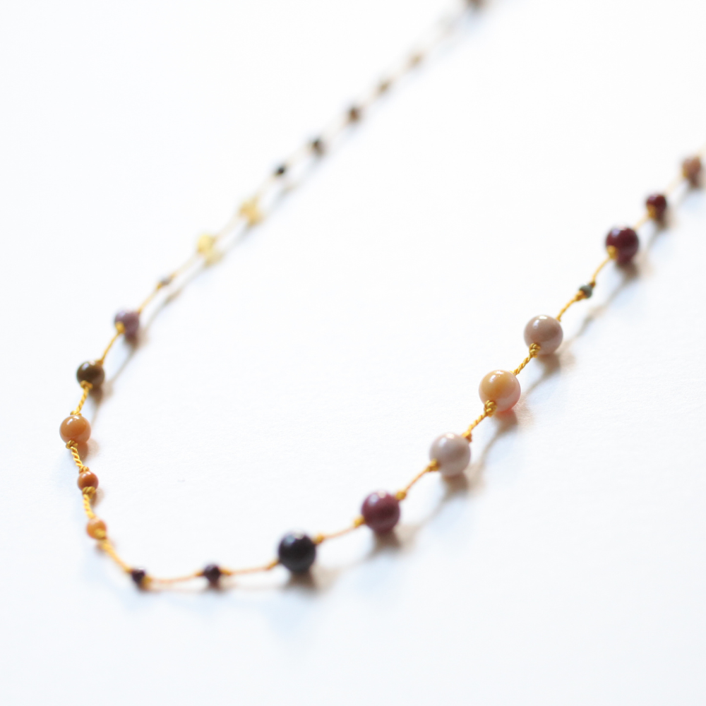 3種類の大きさのムーアカイトを一粒ずつ結んで留めた、定番のAIYANA結びネックレス。