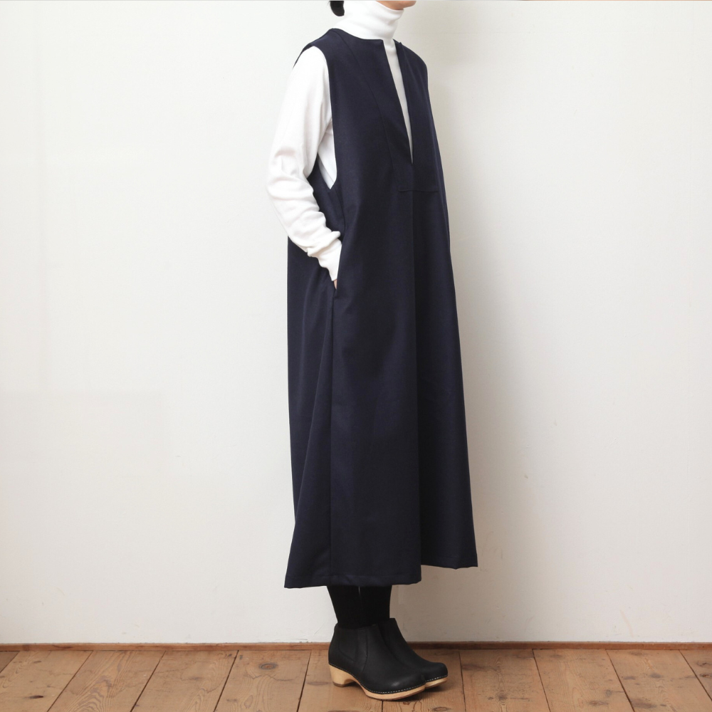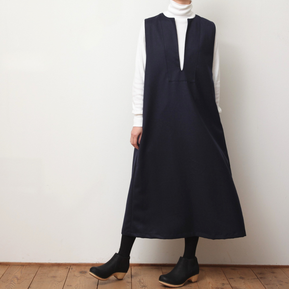 着崩れしにくいパターンを追求した印象的なネックラインや、インナーの自由度が高い大きめのアームホールなど、日常着としての機能性にも配慮しています。