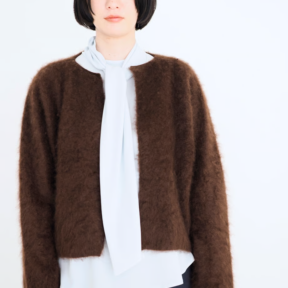 モデル画像では バレルパンツ(8月発売予定)とベロアテーパードパンツとカシミヤファーカーディガンを着用しています。パンツを合わせると、カジュアルな雰囲気に。