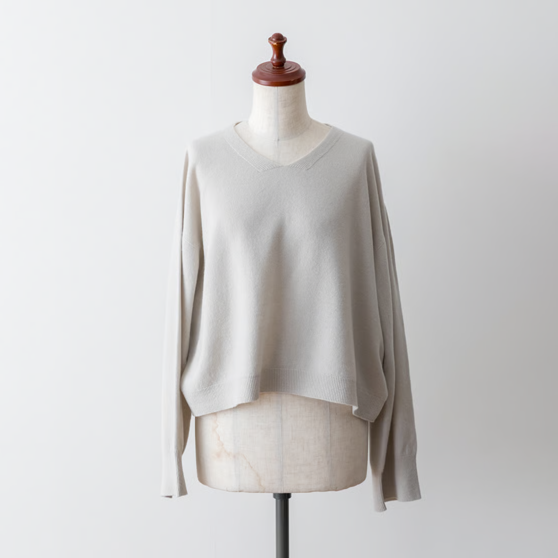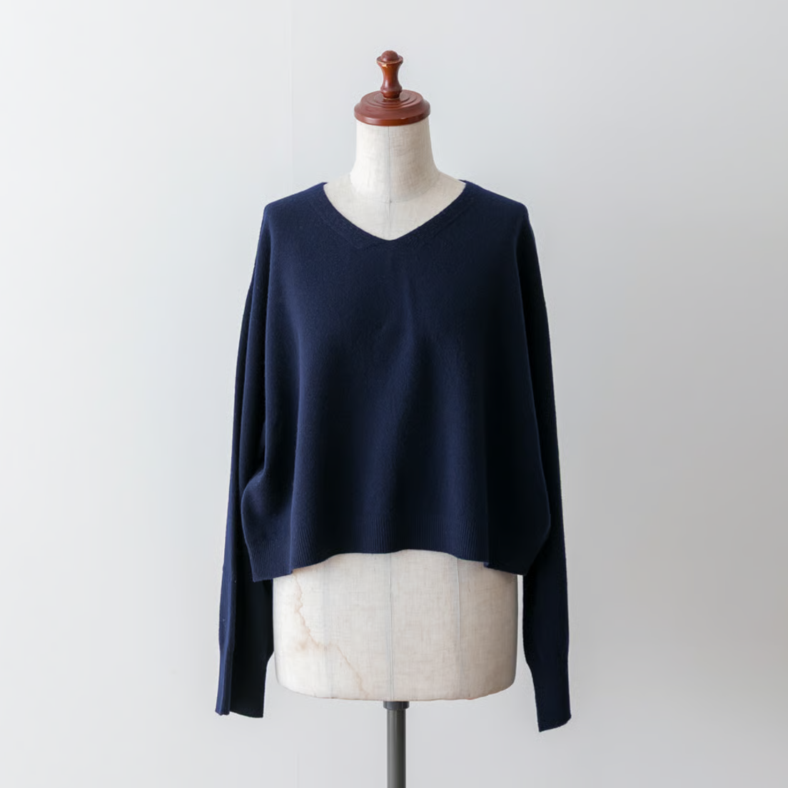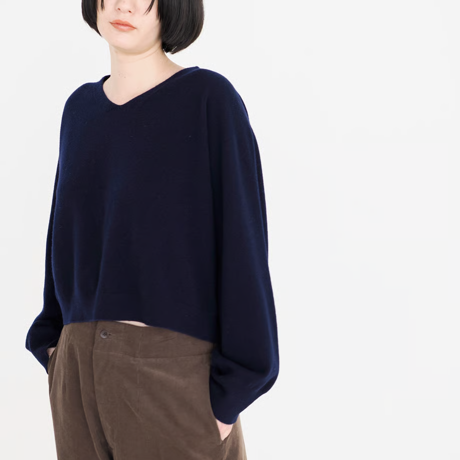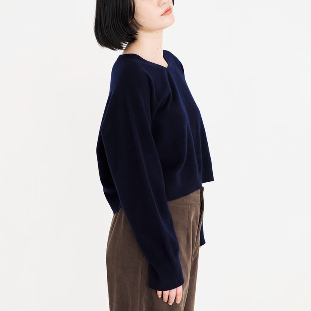 浅いVネックで首元がすっきりと綺麗に見えるニットを品のあるベージュとネイビーで作りました。