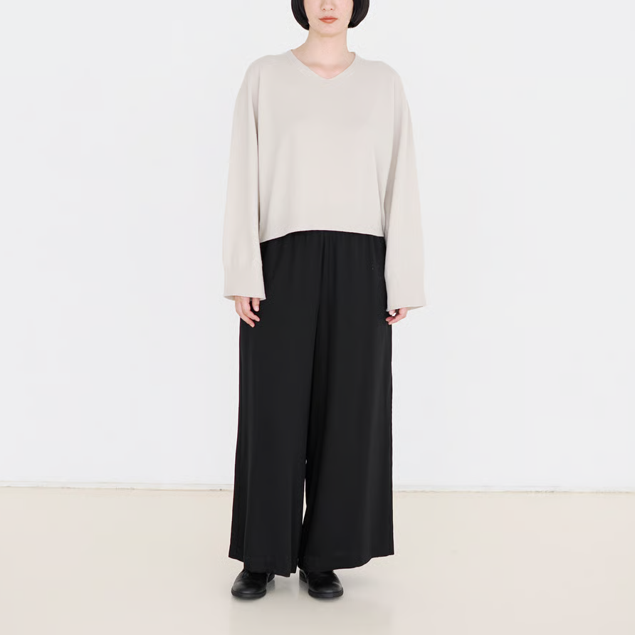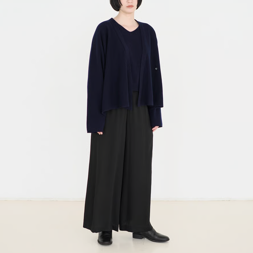 ニットローブとブラックのキュプラワイドパンツと合わせて、シックなコーディネート。
