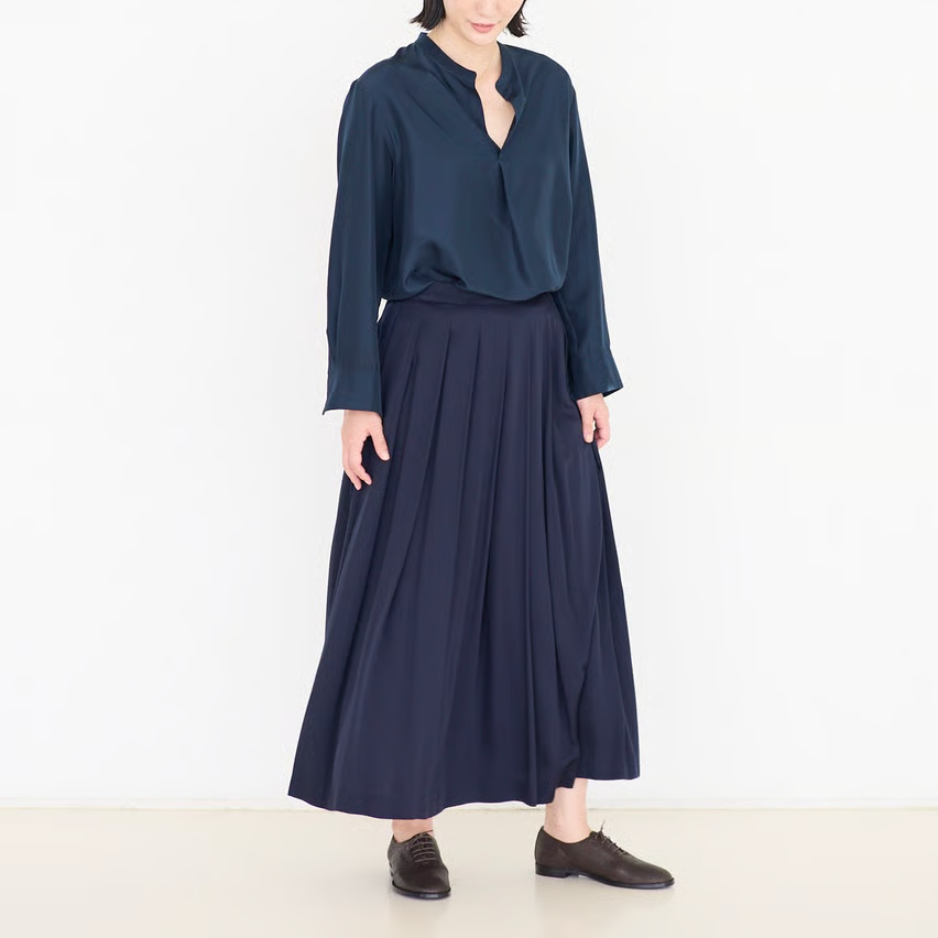 画像のコーディネートはパンツはコットンシルクワイドパンツ、スカートはキュプラタックスカートを合わせています。