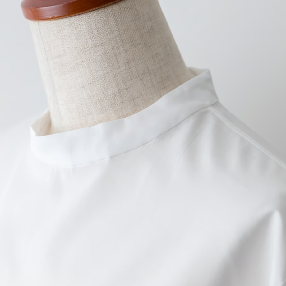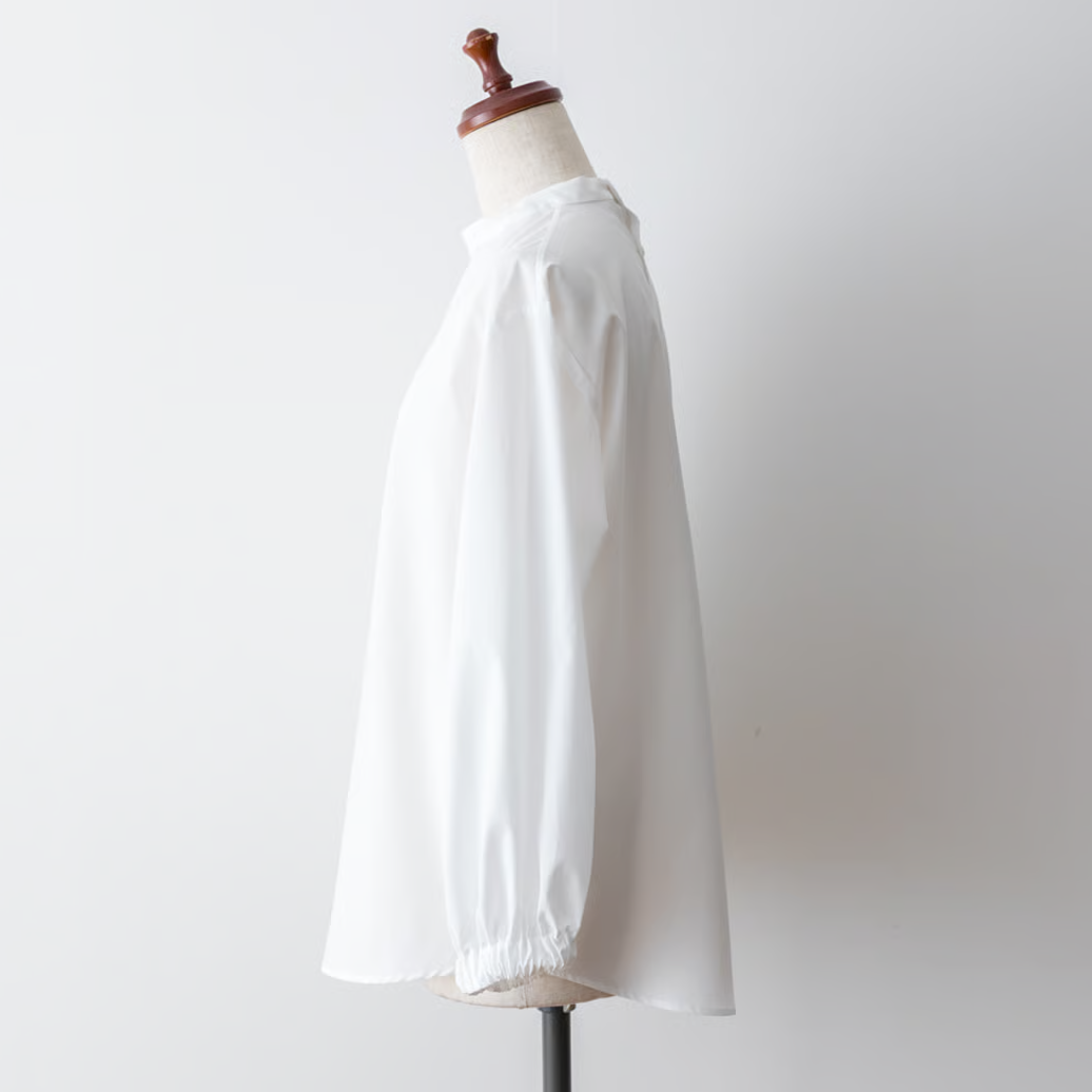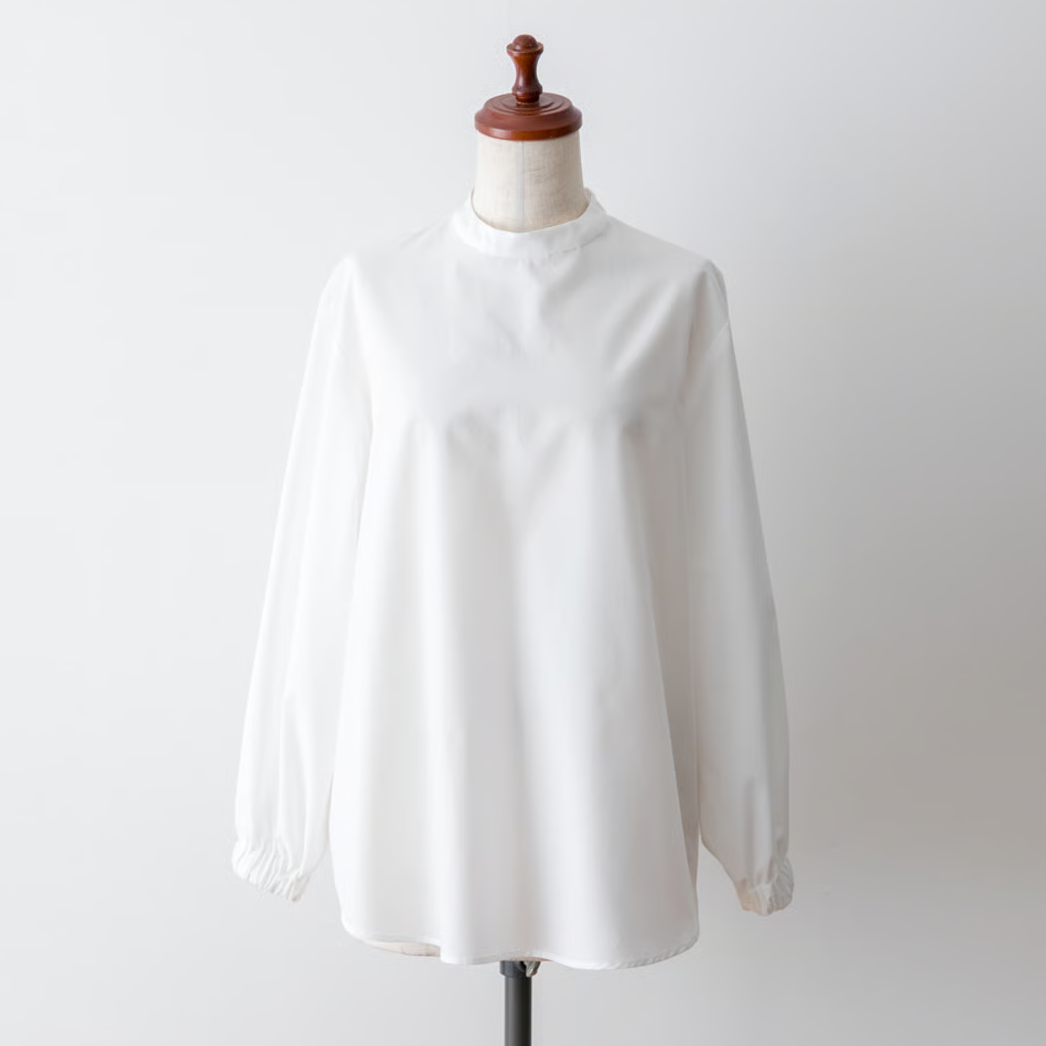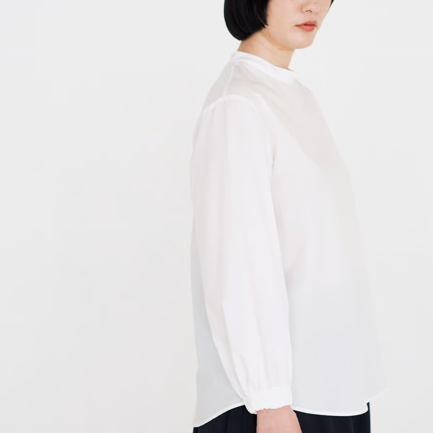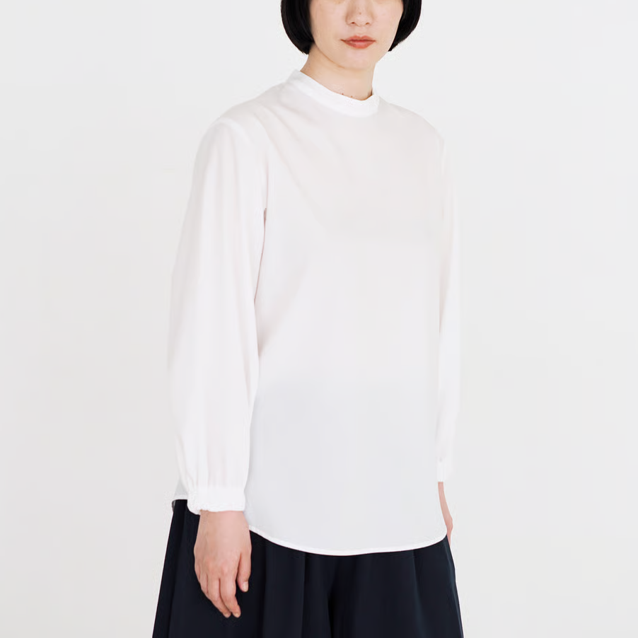 シンプルで上品なイメージのスタンドカラーブラウス。