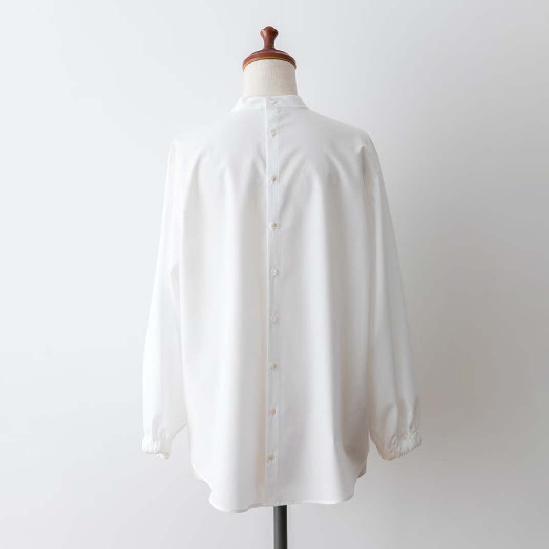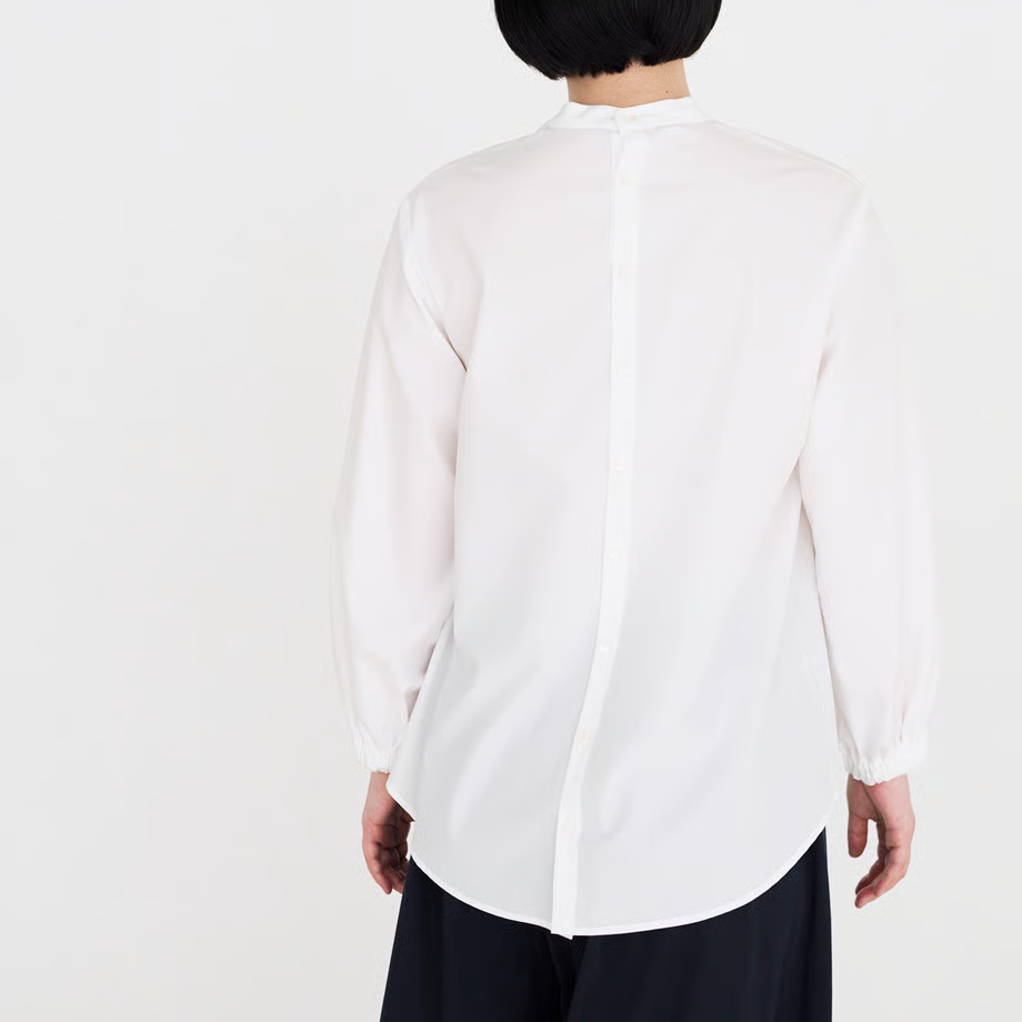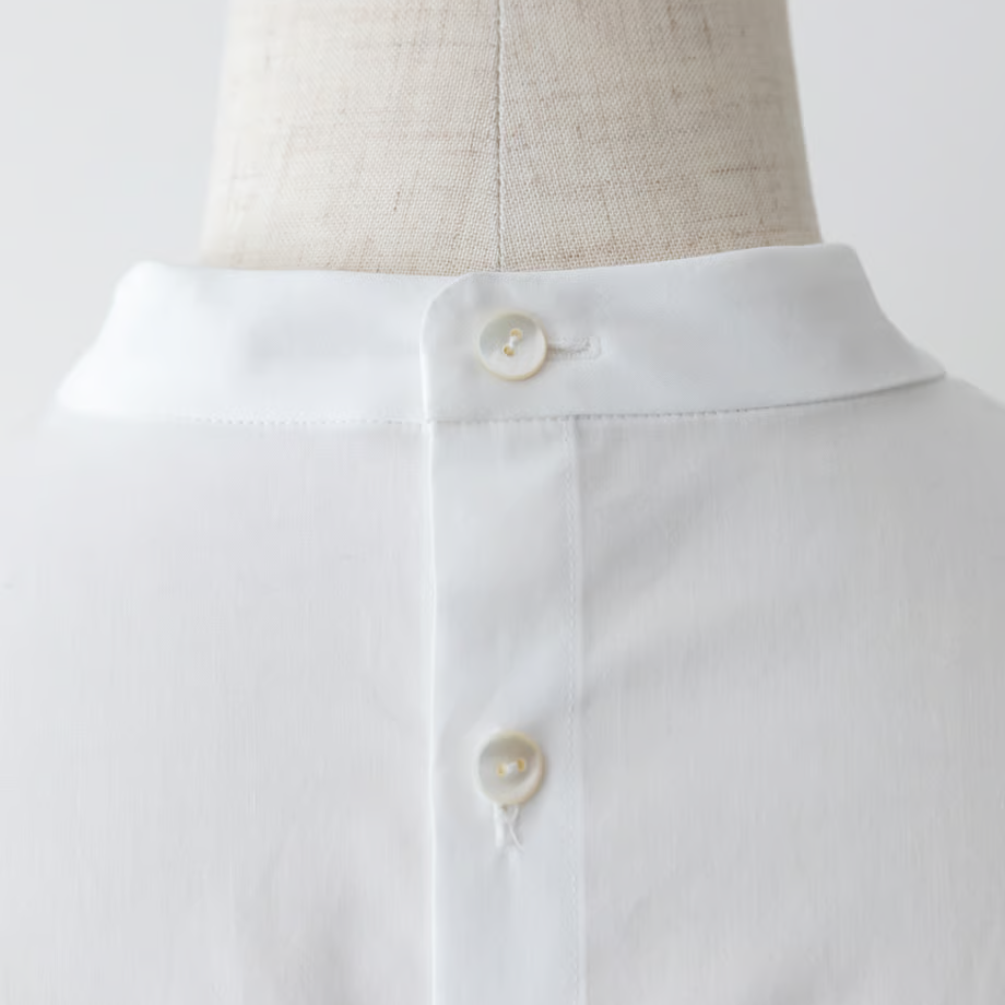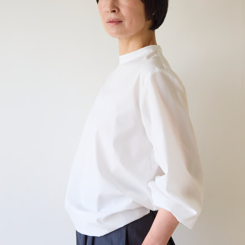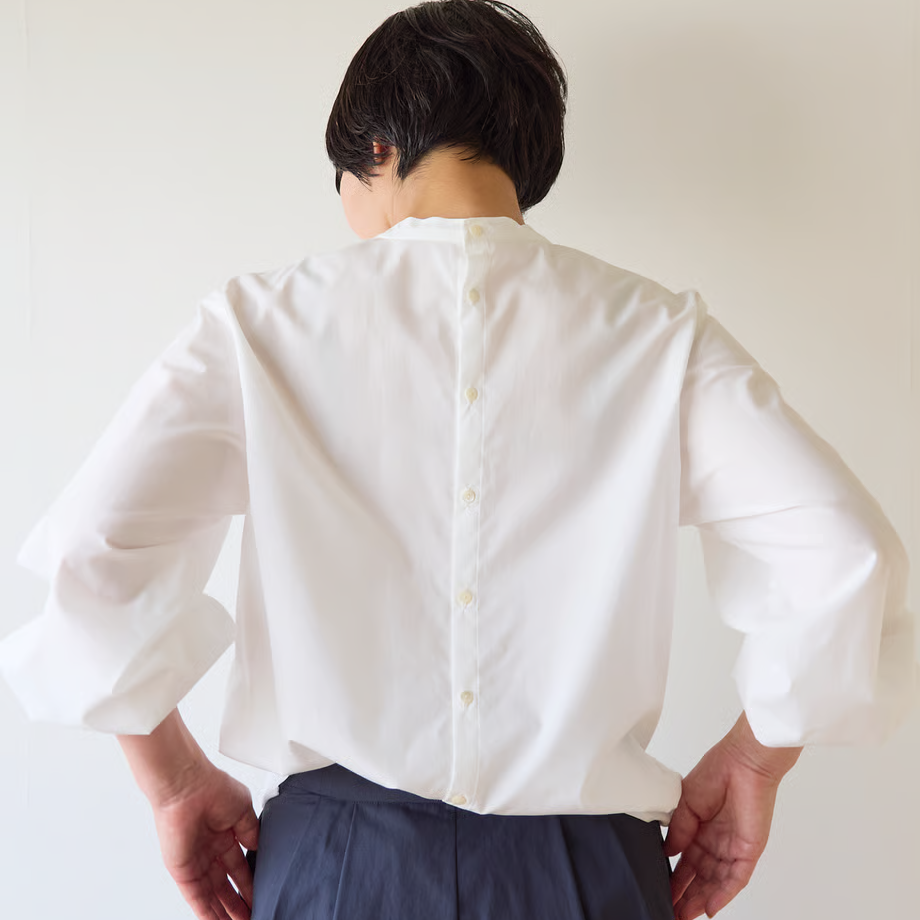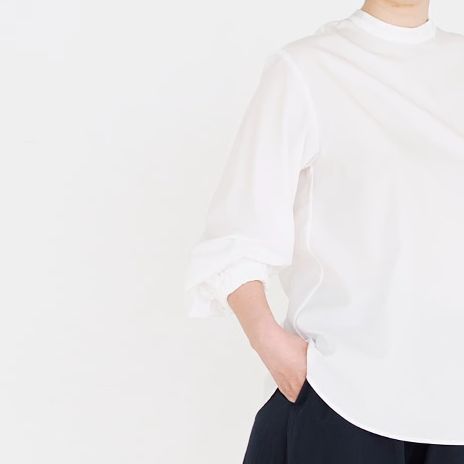 シンプルで上品なイメージのスタンドカラーブラウス。