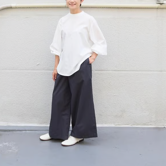 画像のコーディネートはギャザーキュロットスカートと合わせています。