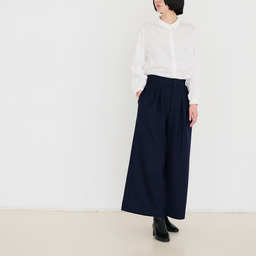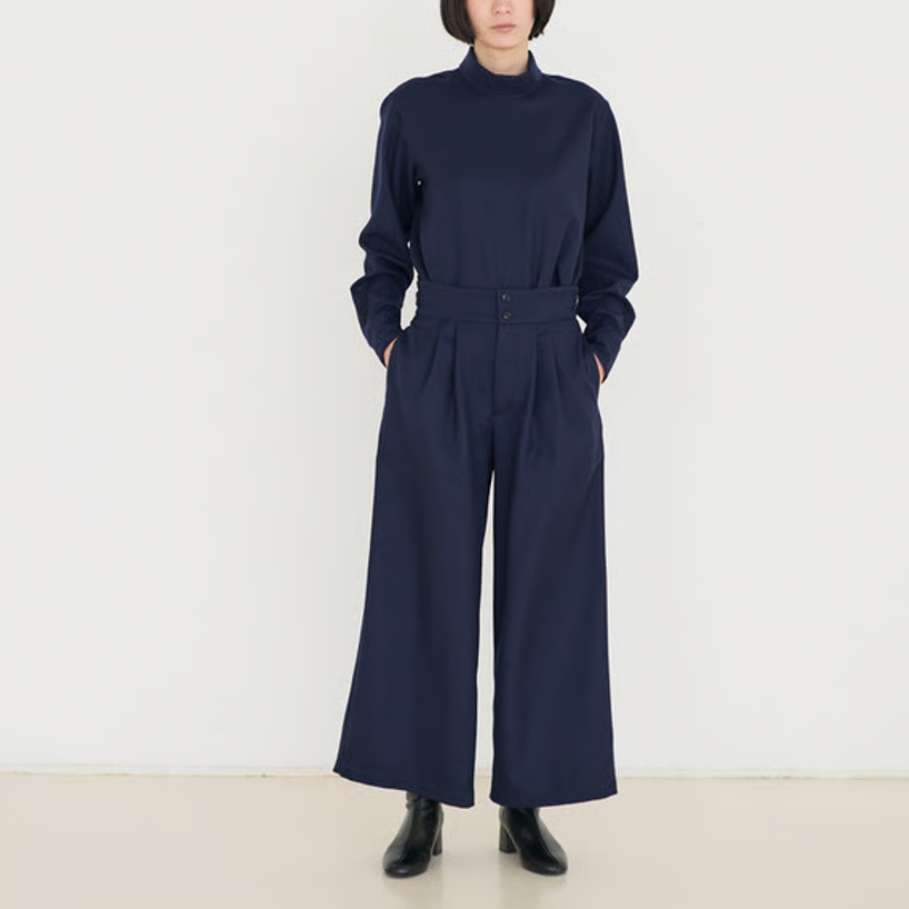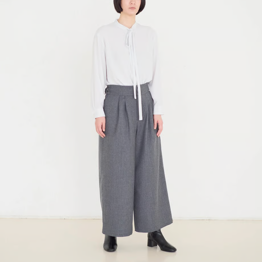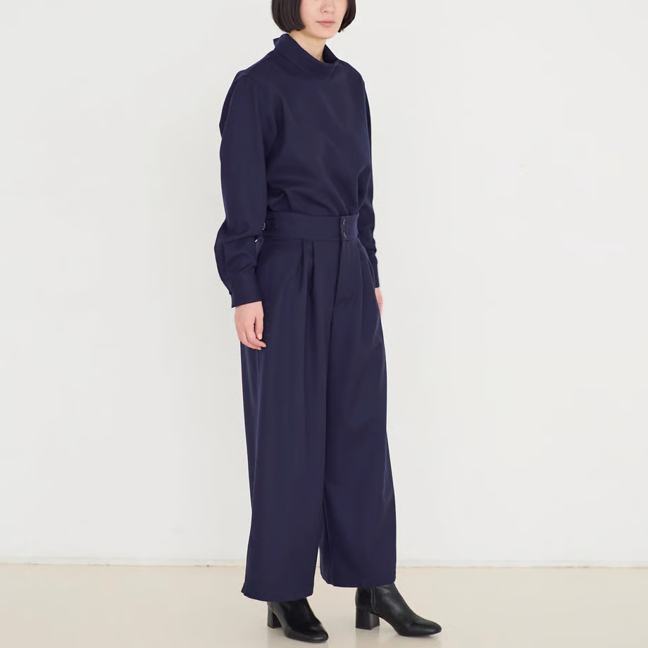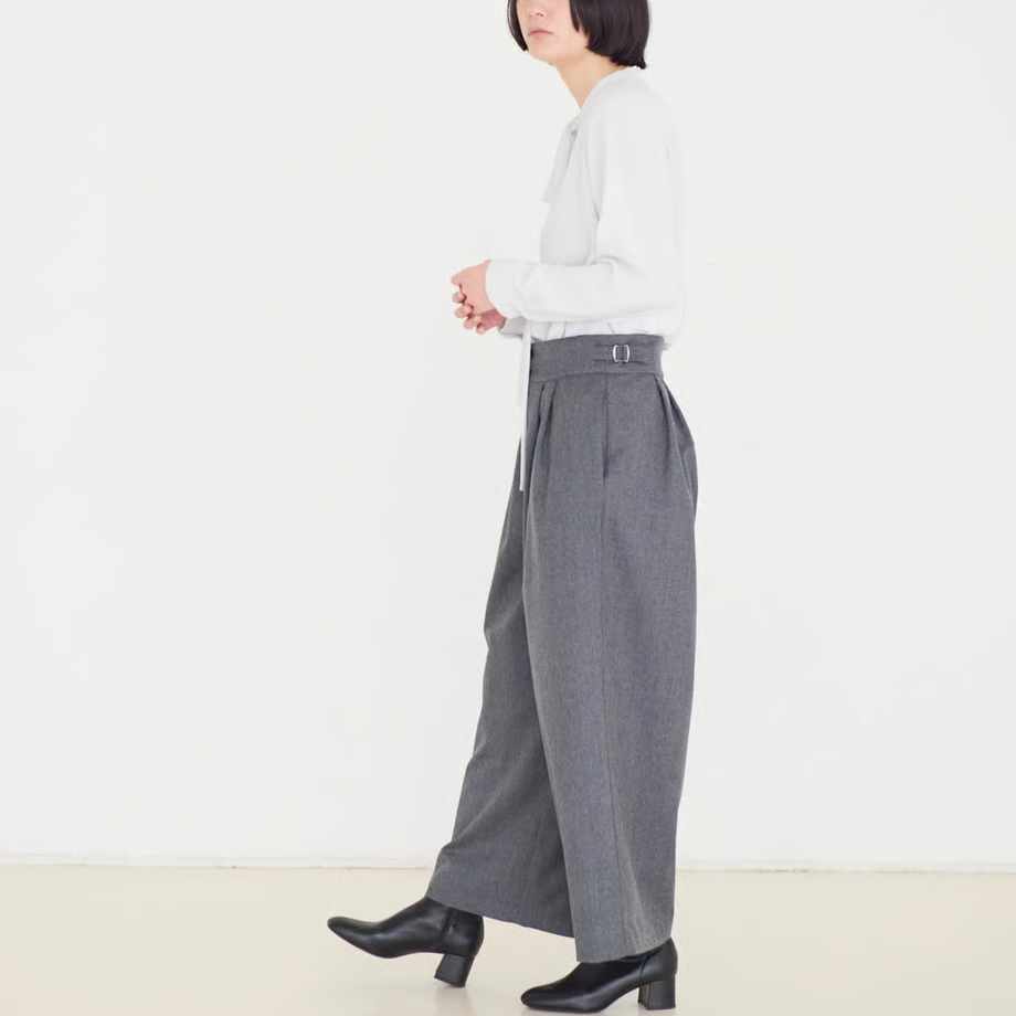 人気の「サイドベルトタックパンツ」をさらにすっきりと見えるよう、後ろ側をダーツにし、ブラッシュアップして作りました。