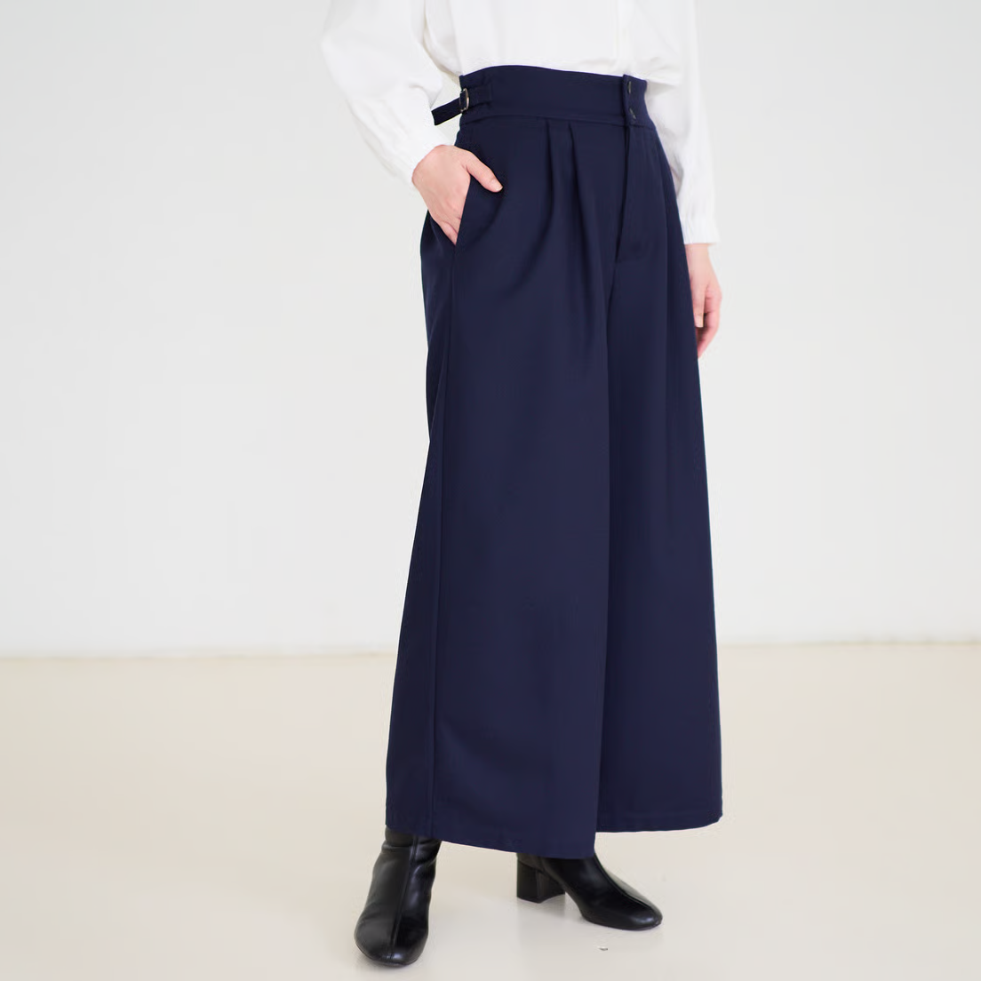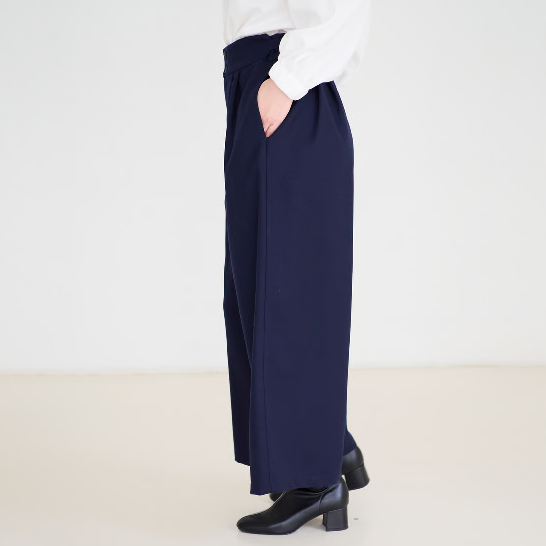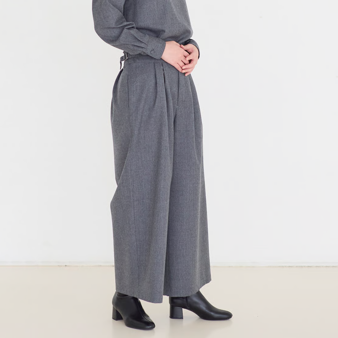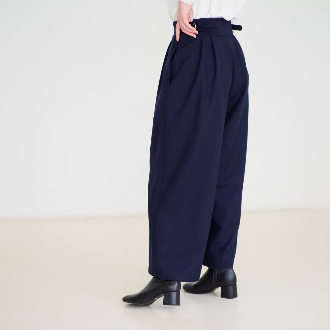 人気の「サイドベルトタックパンツ」をさらにすっきりと見えるよう、後ろ側をダーツにし、ブラッシュアップして作りました。