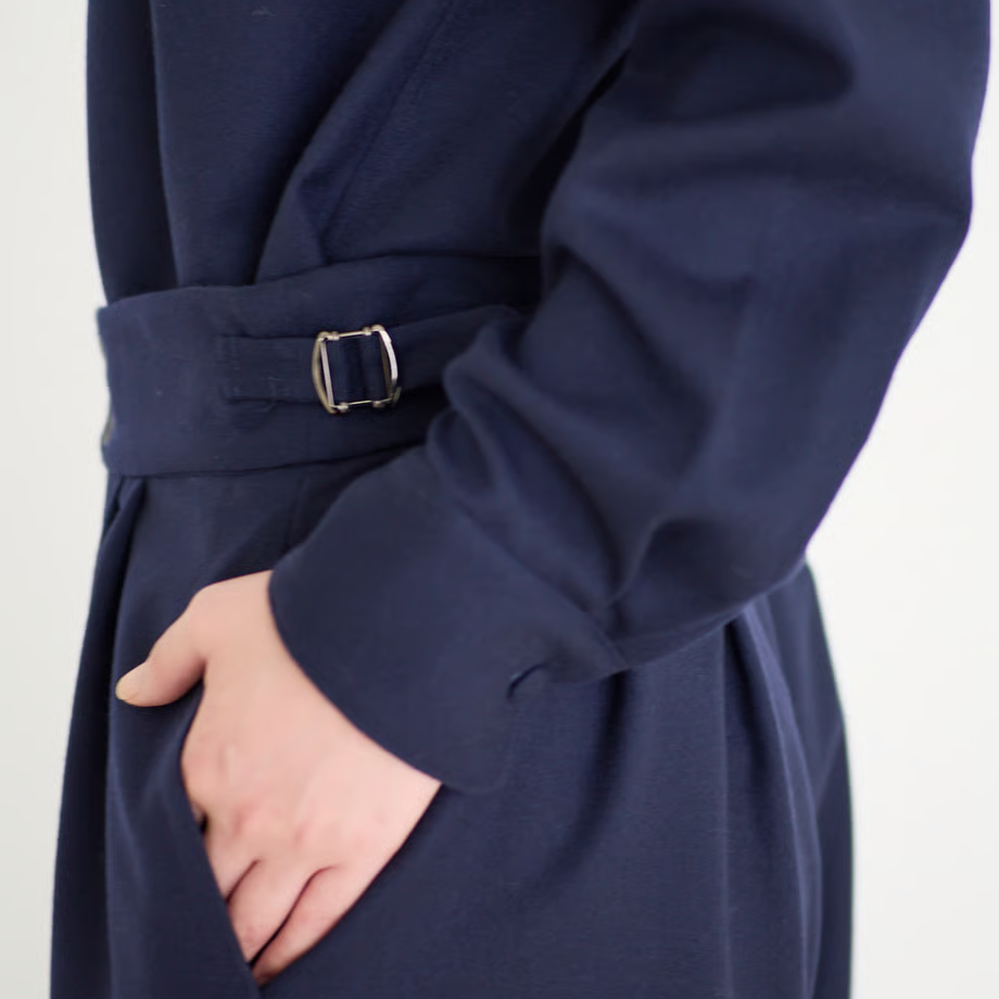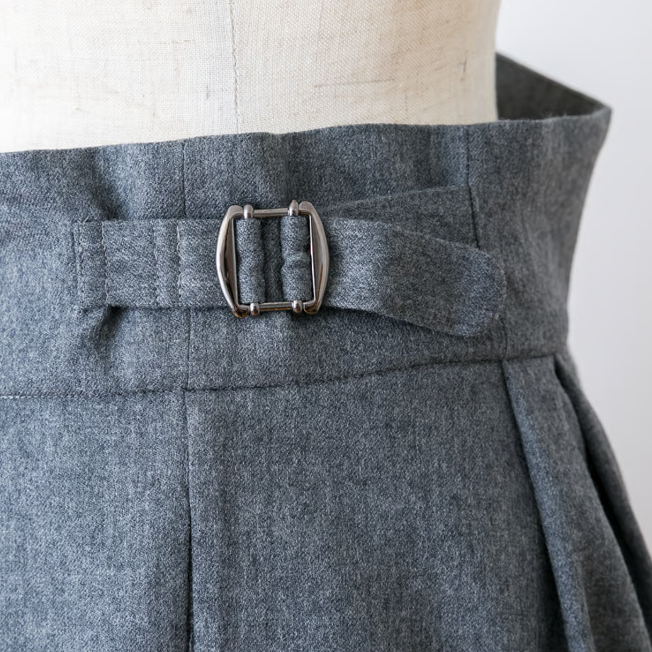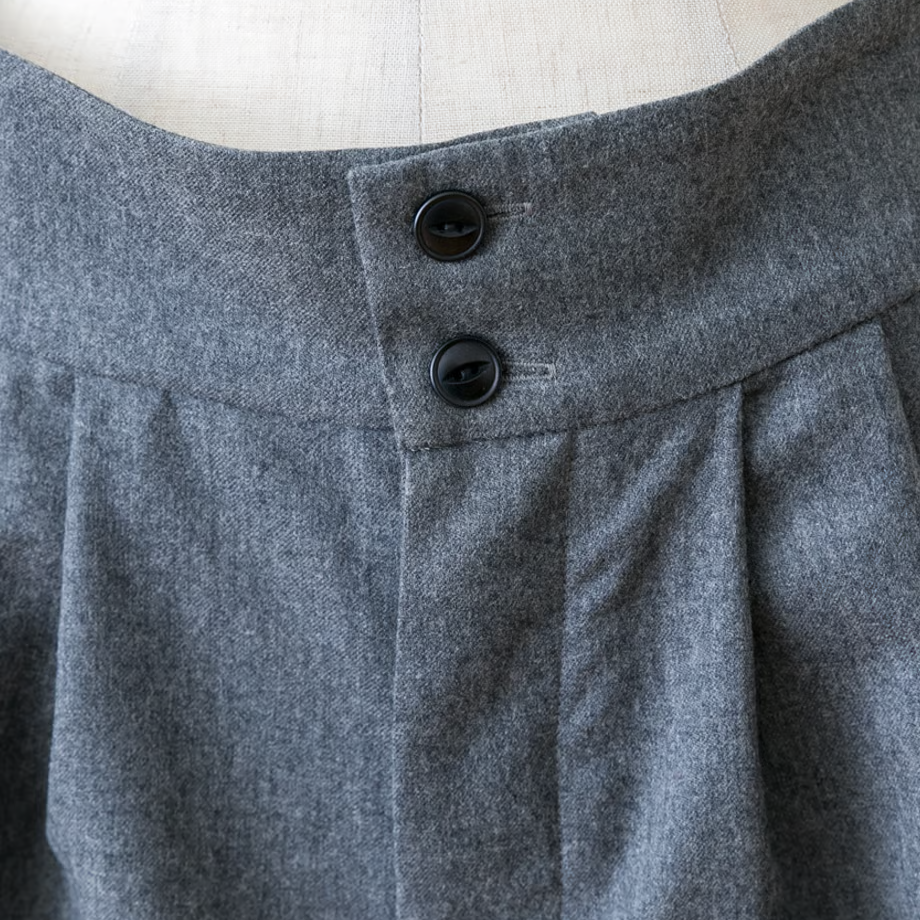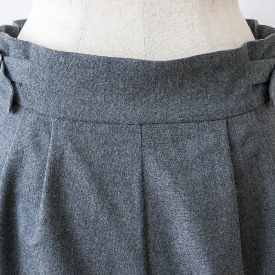 ウエストベルトがあってきちんとした印象ですが、ベルト芯が柔らかいのでお腹を締め付けず、ゆったりするようにデザインしました。