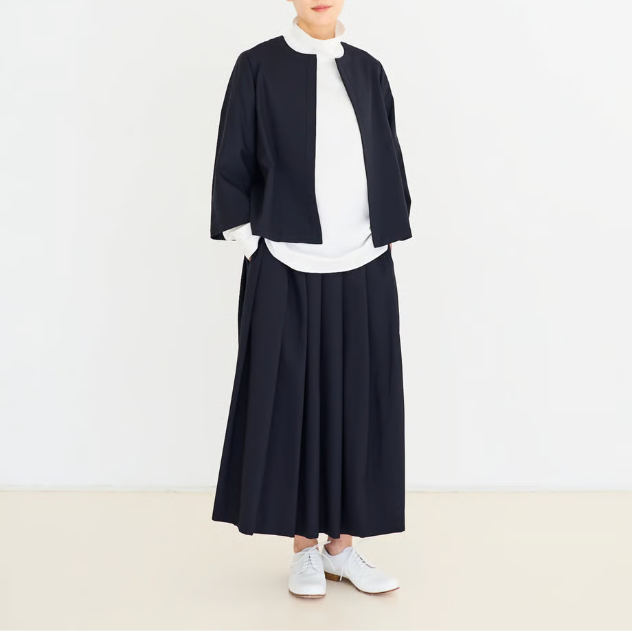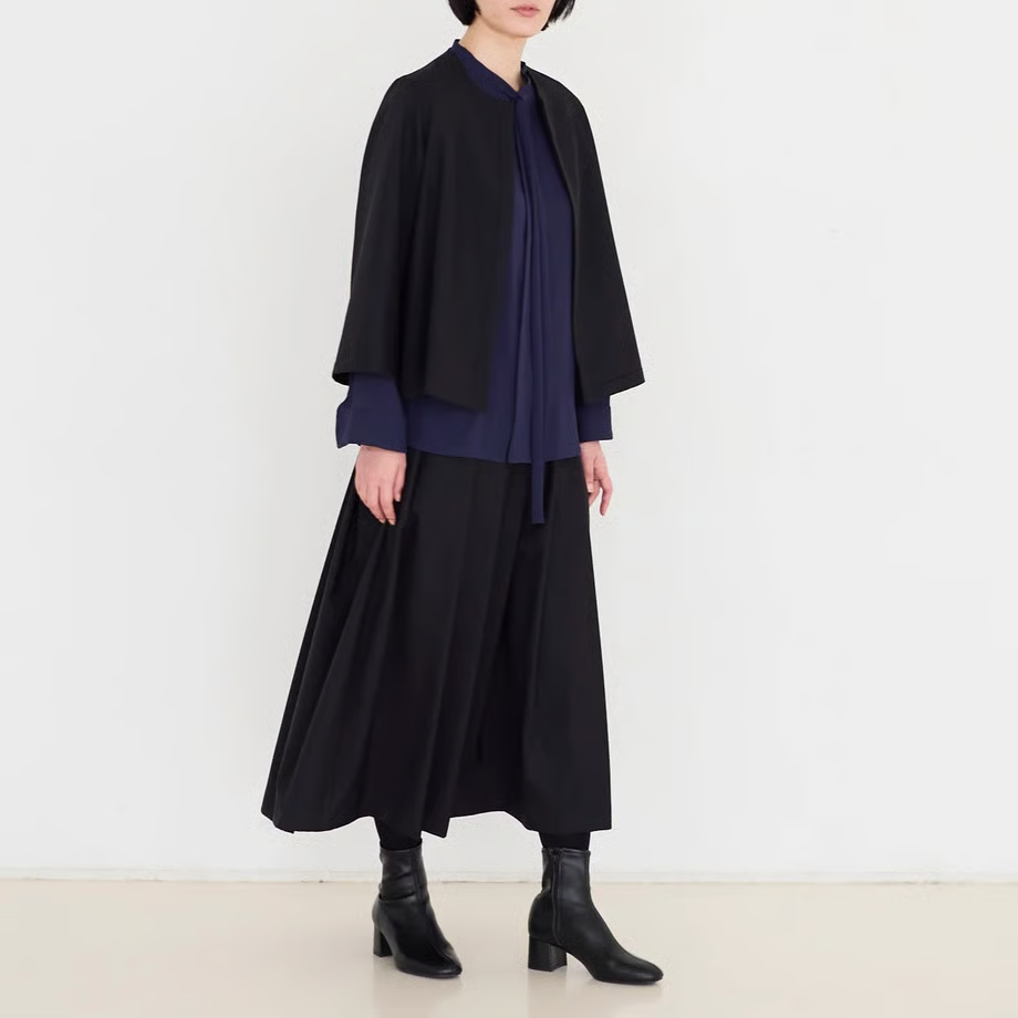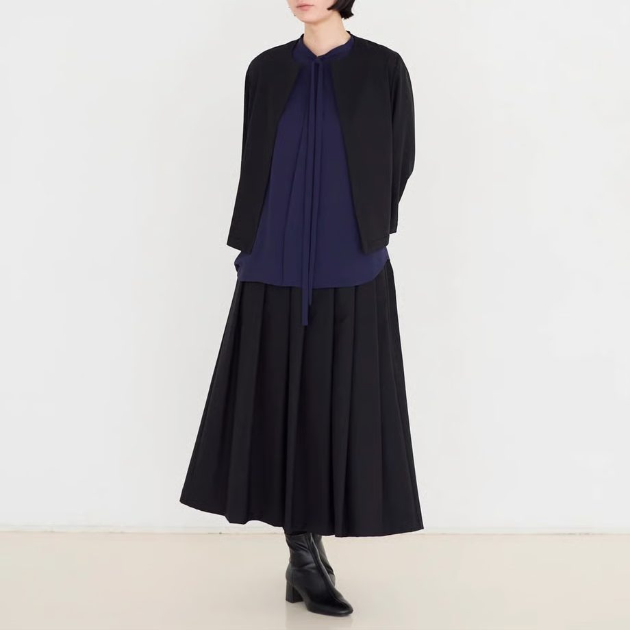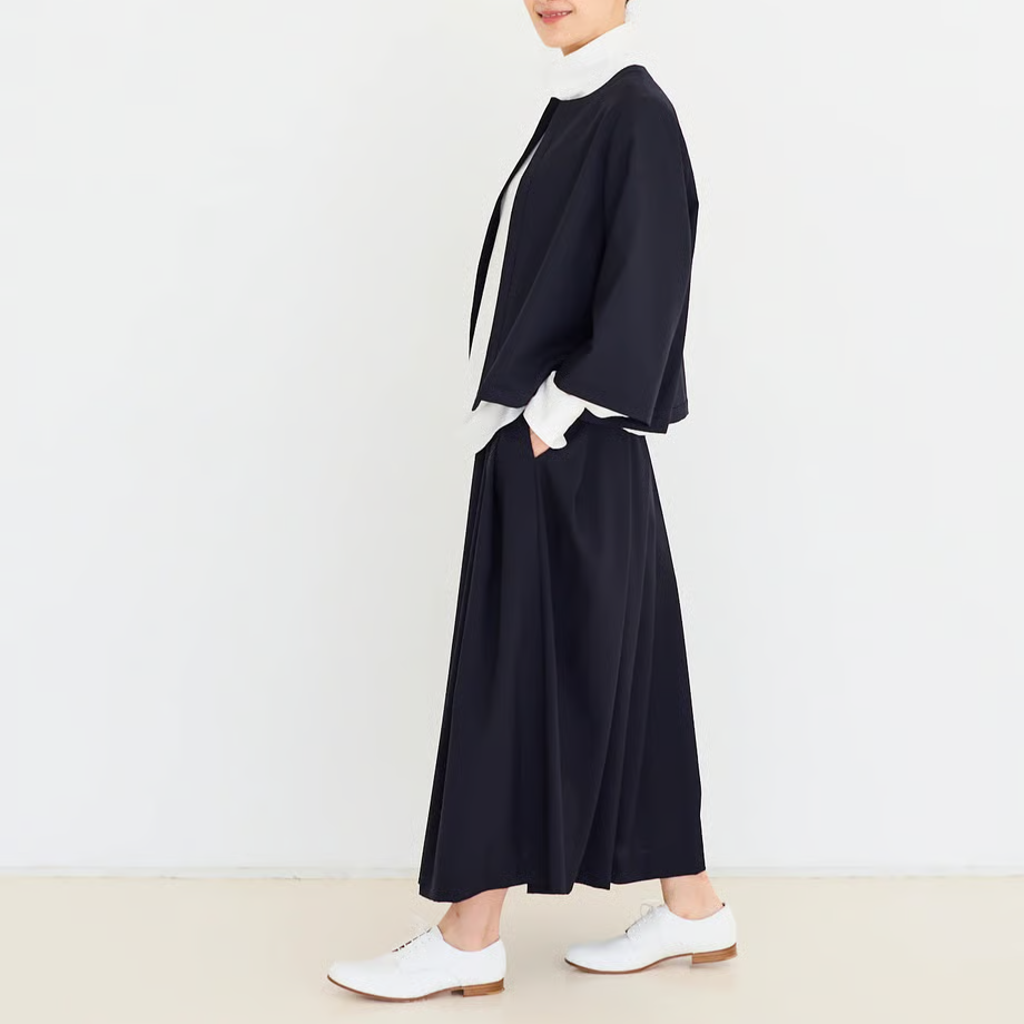 ウールノーカラージャケット 、ウールタックスカート、ウールワイドパンツは全て同じ生地です。